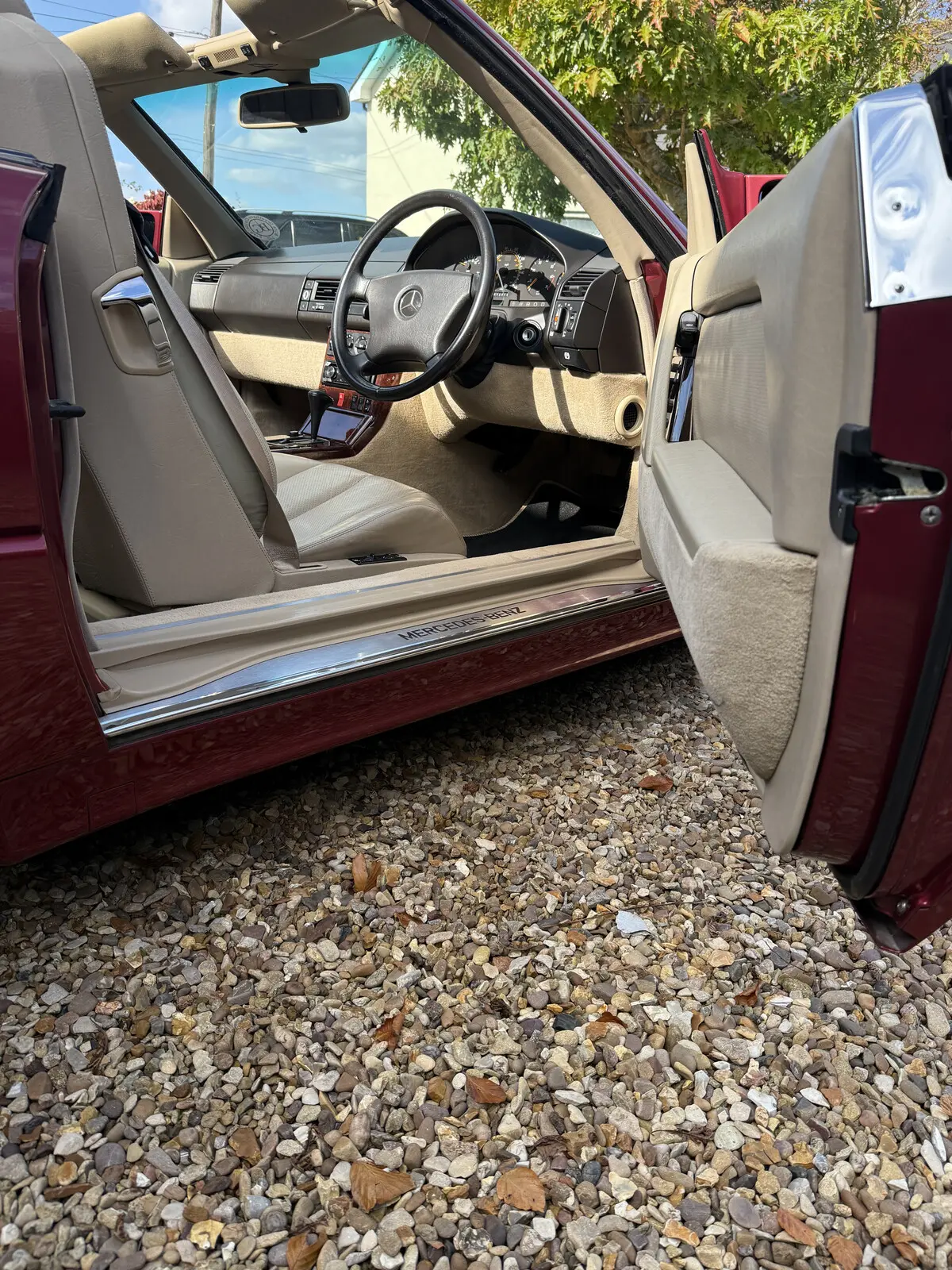 This stunning R129 500SL started life in Guernsey in 1991 until the year 2000, it was then imported back to the UK until 2013, and then taken back to Guernsey until 2022, still with the first owner. The 2nd Owner has owned it to the current date. So it is only 1 previous owner vehicle. Painted in the beautiful Almandine Red metallic paintwork, matched with a cream mushroom leather interior. The History file is documented throughout its life with all matching keys, wallet, and service book. It has recently, in 2024, had a healthy investment made to bring everything in line mechanically and cosmetically to the owner's personal standards, a sum of over £15000.