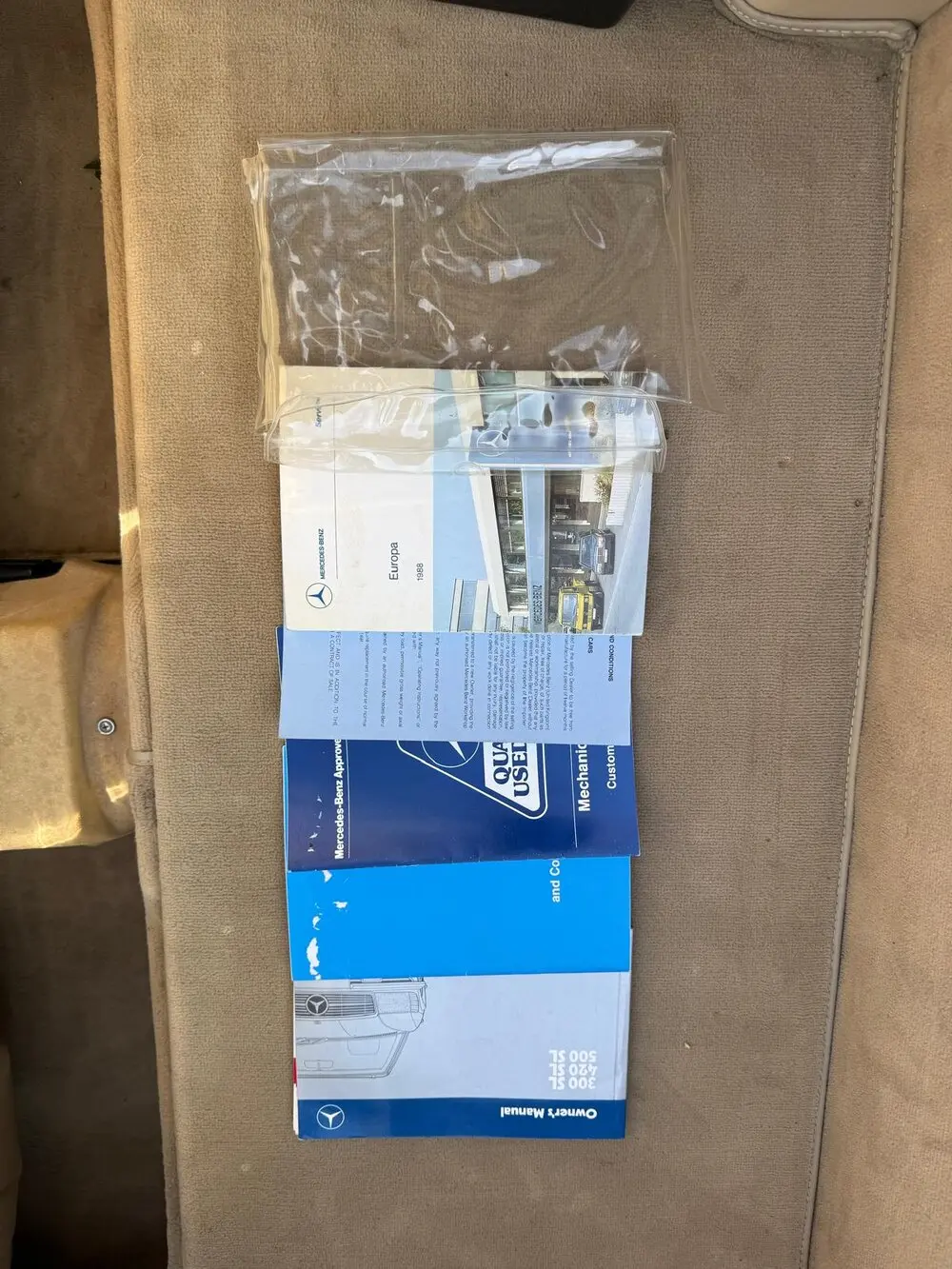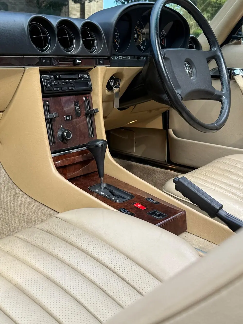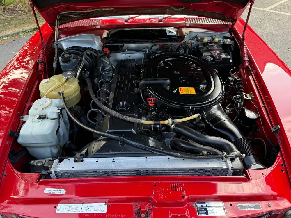 The bulkhead chamber was inspected by me and found to be in complete original condition, showing factory spot welds and body coloured sections. This is an important part of a R107, which can be very easily overlooked and taken for granted. All original carpets look fresh. The wood console is showing its nice, lush finish. Overall, this is a very genuine R107 which has not been over-spent to give it the look. The leading edges of the arches have been stone-guarded to give it the protection it deserve. It fires up the key without any hesitation and performs perfectly with the nice 300 exhaust tone.